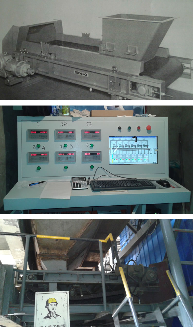 一臺電腦控制六臺定量給料機(jī),用電腦進(jìn)行配比操作,用變頻器調(diào)節(jié)皮帶地快慢,用控制儀表來調(diào)節(jié)補(bǔ)給量。